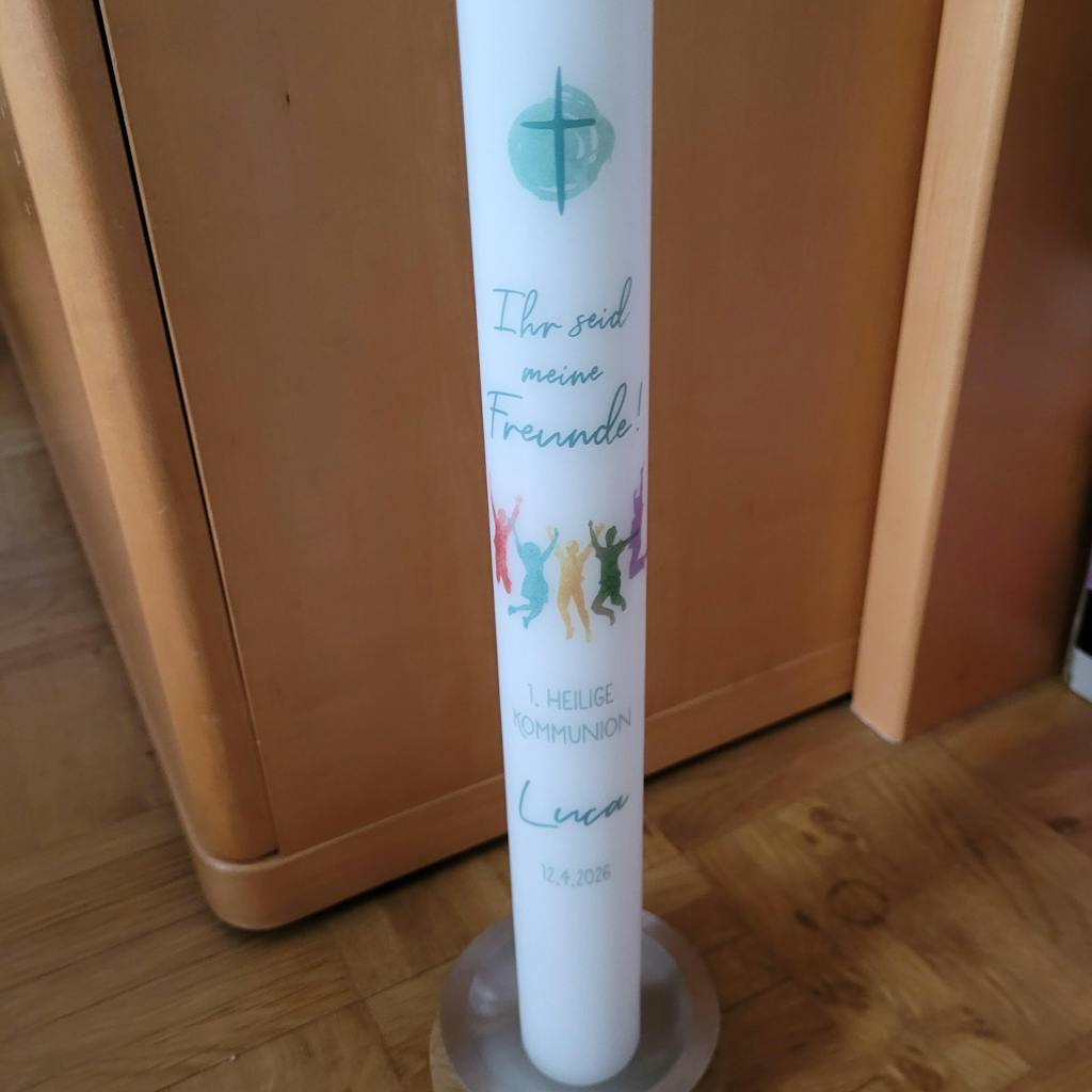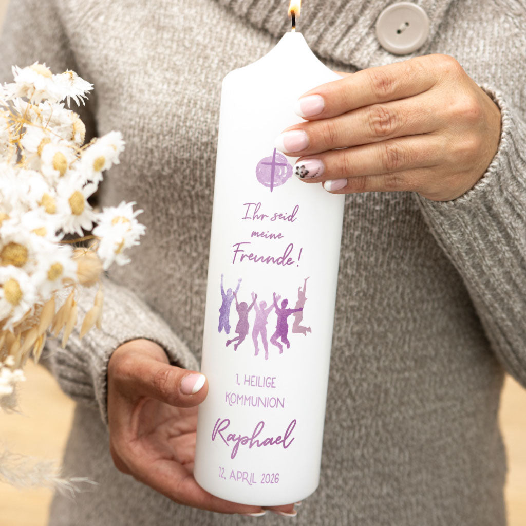 Neues Jahr, neue Kommunionkerze – auch für 2026 haben wir passend zum Motto des Jahres „Ihr seid meine Freunde“ die passende Kommunionkerze gestaltet. Mit den fünf Farbvarianten ist für jedes Kommunionkind das passende dabei!