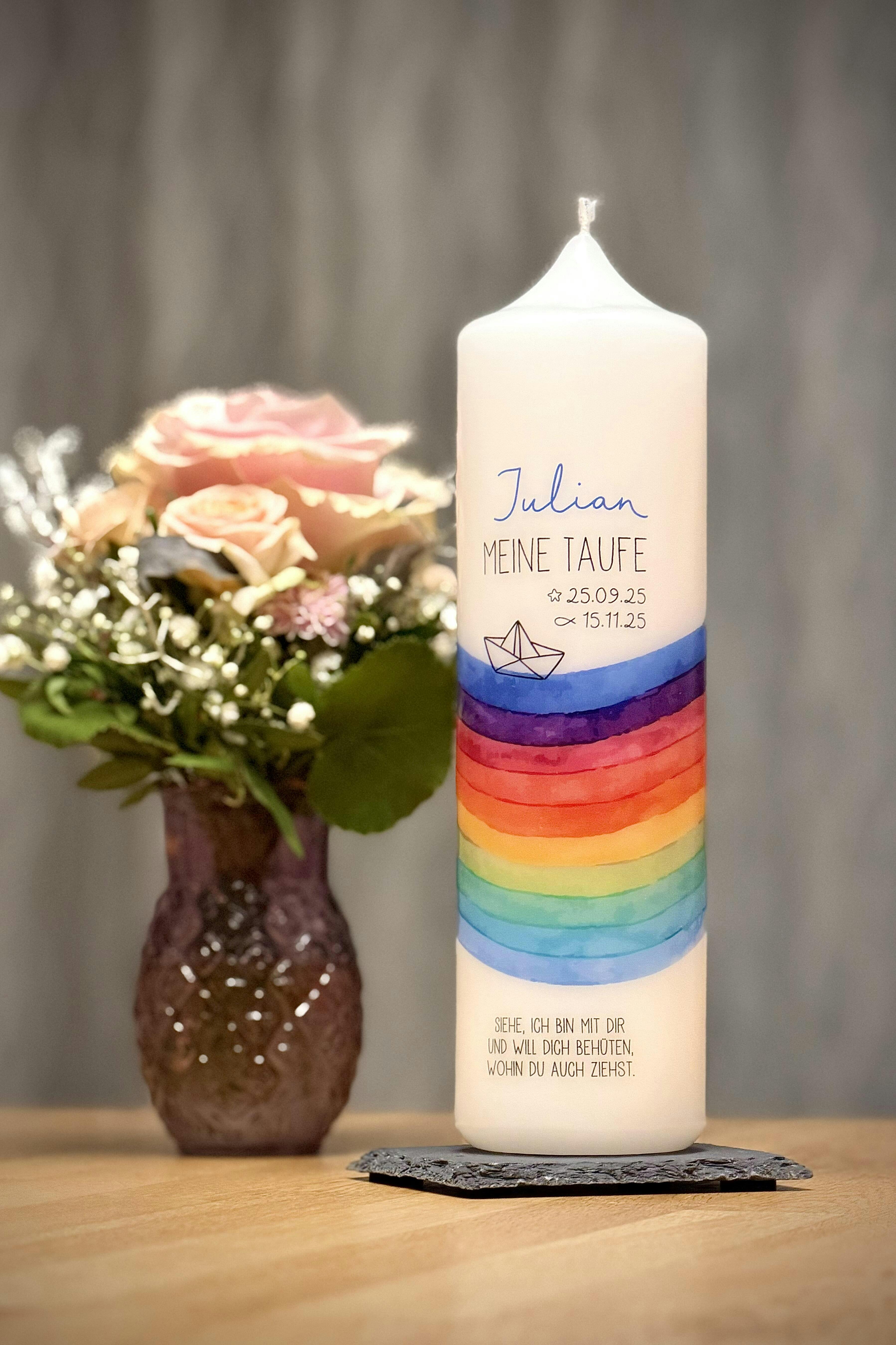Unsere Taufkerze Regenbogen – Aaron vereint gleich mehrere Taufsymbole in sich: den Regenbogen, Wellen, ein Boot oder einen Fisch und einen Taufspruch. Das ist nicht nur praktisch, sondern sieht dabei auch noch verdammt gut aus: überzeugt euch selbst!